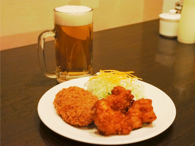仕事帰りにビールと揚げ物が食べたくなったら迷わず大正軒へ向かおう。やわらかでジューシーなから揚げとふんわりとした食感のメンチかつ、そしてビール(まはたチューハイ)がセットになった「ちょいのみセット」はホームページを見たと申し出た人のみに提供される限定メニュー。巣鴨で大正時代に始めた精肉店直営だから鮮度の見極めも抜群。絶妙のタイミングで揚げられたアツアツがいただける。