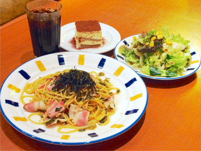 パスタからデザートまですべて手づくり。大人から子どもまで楽しめるマイアミガーデン。パスタ・サラダ・デザート・ソフトドリンクがついたAセットと、ソーセージ・生ハム・1/2サイズのパスタ・生ビール(またはワイン)がついたBセットはいずれもHPを見たと申し出た人のみ限定の特別メニュー。デザートはティラミスのほか数種類あり。その日によって内容が変わるのでスタッフに尋ねてみて。
