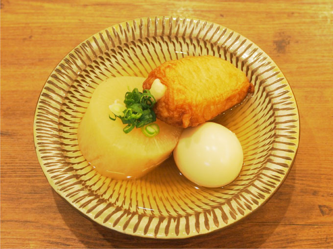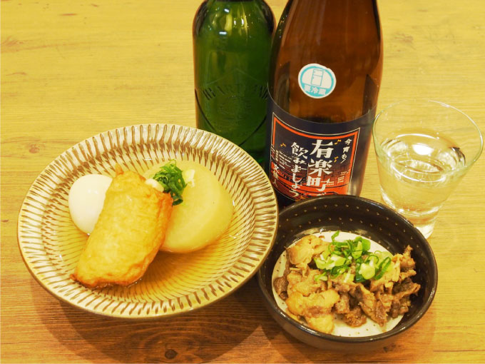 歯ごたえのある親鶏を甘辛く煮たかしわと、博多おでんをビールと日本酒を楽しめるどげんこげんも千ベロセット。いりこの効いたダシをたっぷり含んだおでん3種盛と、数種類のなかから選べる日本酒の銘柄はその日によって変わるそう。この日の練り物は博多ならではの味・餃子巻。餃子まるごと一個を練り物で包んだ斬新な一品だ。そして有楽町で飲むならやはりこのお酒「有楽町で飲みましょう」でキマリ。