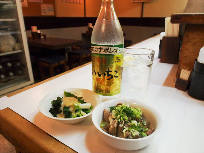 大皿いっぱいに盛られた惣菜がずらりとカウンターに並ぶ季節料理・西田。なかでも酢味噌の塩梅が絶妙なぬたと、こんにゃくやごぼうと共に煮こまれたモツ煮に焼酎3杯がセットになった西田スペシャルは、ゆっくりお酒を楽しみたい方におすすめ。家族のからだを思いやるかのような優しい味付けと、店主ご夫婦との会話が一日の疲れを癒やしてくれる。お母さんの気まぐれによりポテトサラダが提供されるかも?