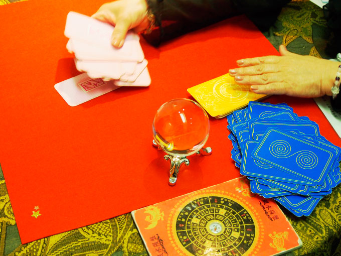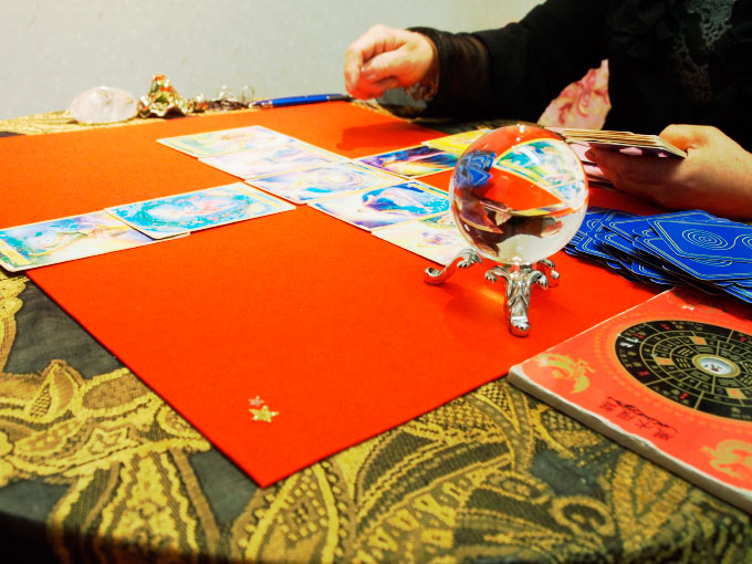 ここからはタロットを使って鑑定です。YURIAさんが使うトートタロットは、難解で魔術的でもあり、使える人が少ないのだそうです。「良し悪し、右左など単純な二者択一ではなく、相対的な運命の流れを見ていく、すべてが総括して見えるツールです」とYURIAさん。