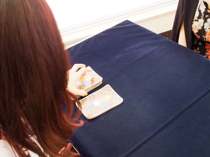 カードは占われる半田さん自身が左手で3つに分け、さらに山のひとつを残りの二つの山に分けて置きます。